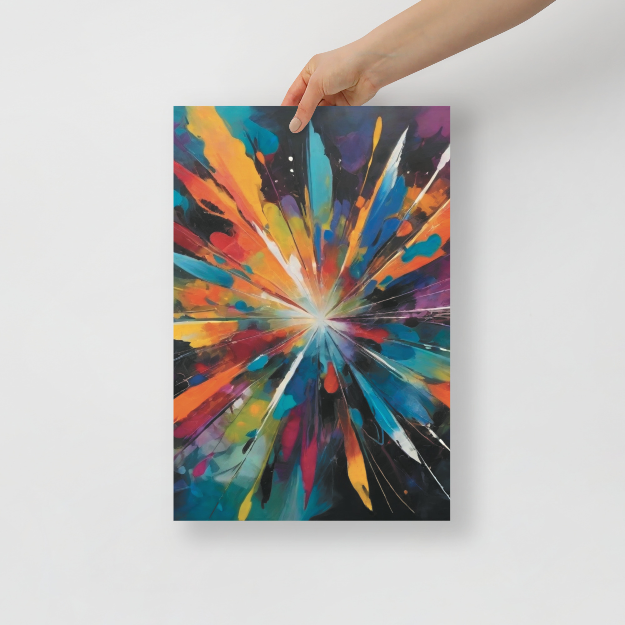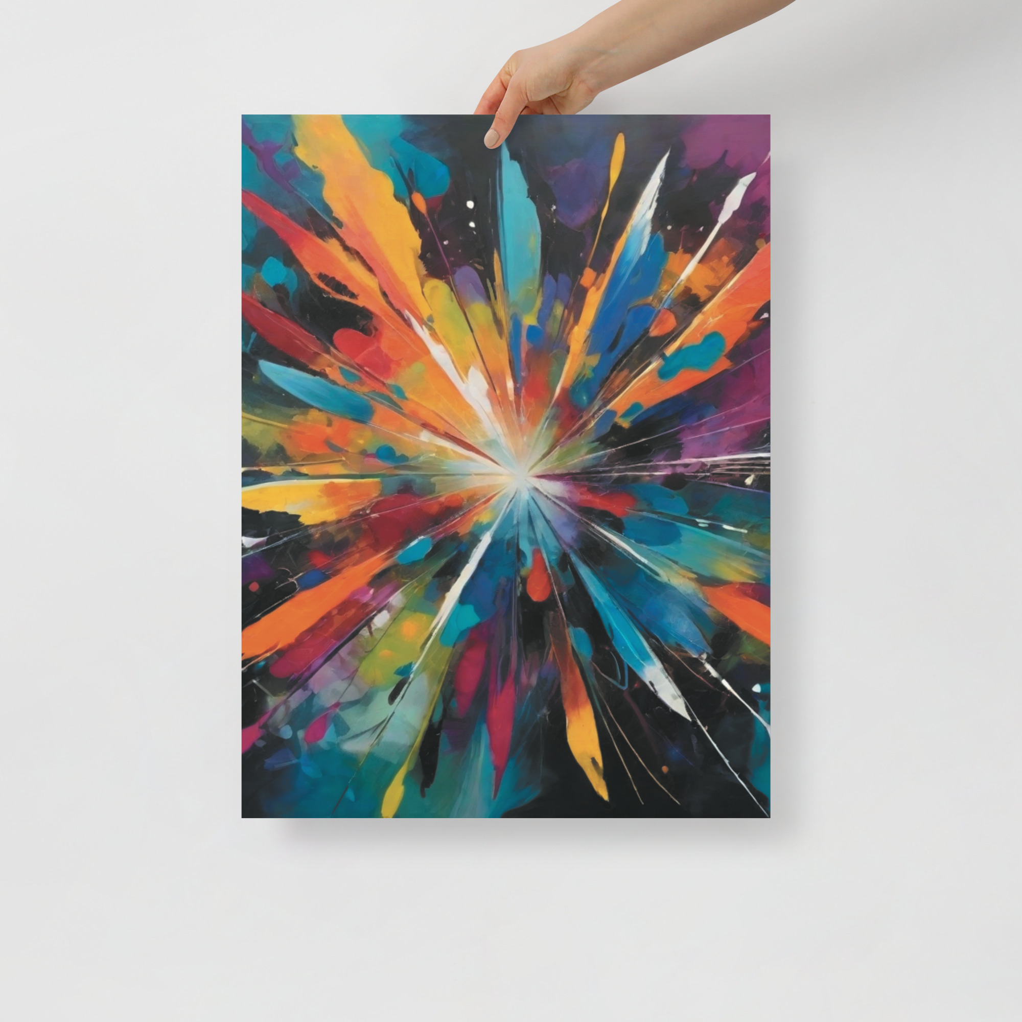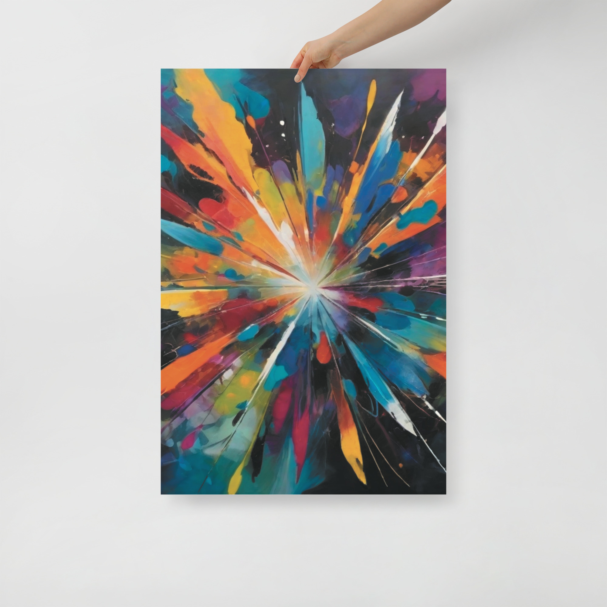“Chromatic Explosion” is an abstract painting that captures the instantaneous moment of a color burst. The composition is centered around a brilliant white light from which a spectrum of colors emanates in a dynamic radial pattern. The vibrant splashes of paint suggest a high-energy release, reminiscent of a cosmic event or a spectacular firework display. Each streak of color is rendered with a sense of velocity, and the drips and splatters contribute to the feeling of motion and raw energy. This piece is a celebration of color and its capacity to evoke emotion and movement, representing an uninhibited release of creative force.