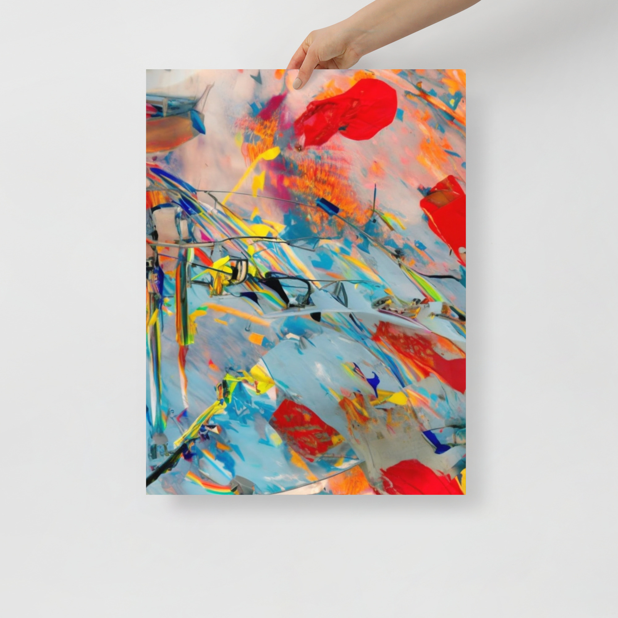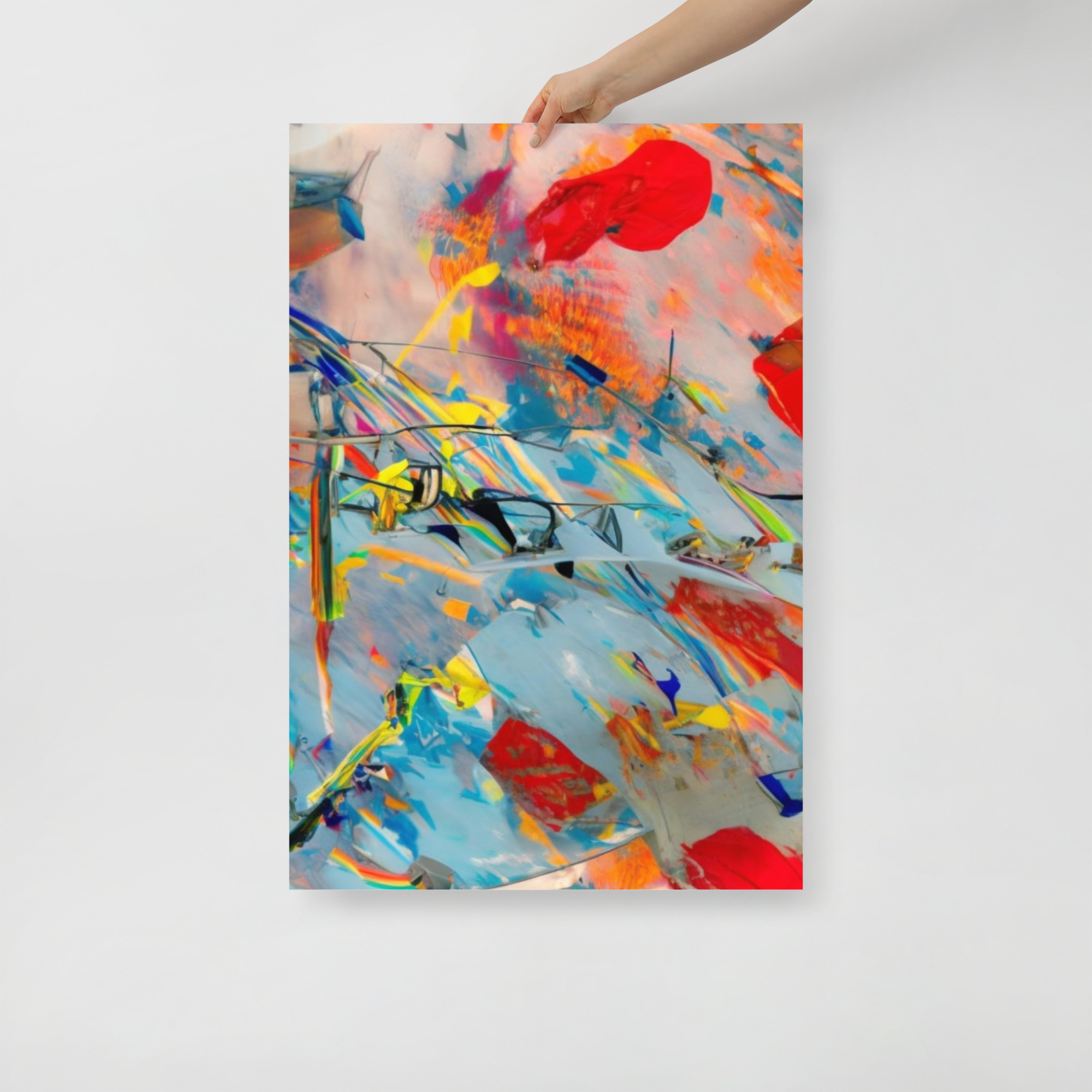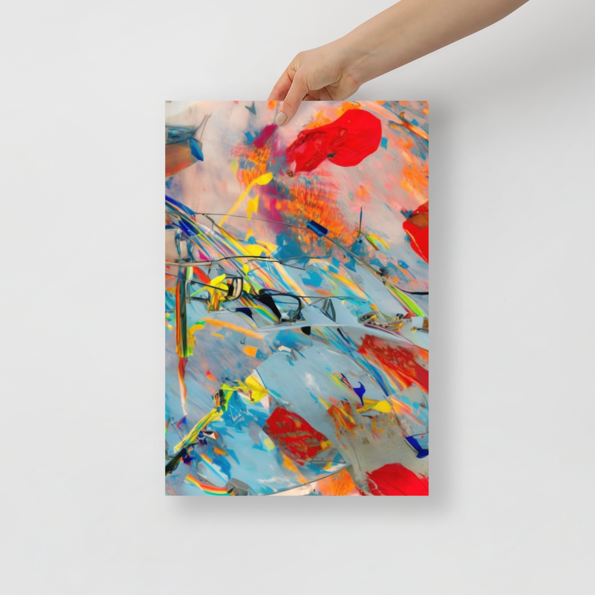 “Ephemeral Tapestry” is a striking abstract painting that captures a momentary burst of creative expression. The piece is characterized by its translucent layers and energetic brushstrokes that convey a sense of fleeting beauty. Splashes of red and bold yellows emerge from a pastel background, suggesting a canvas in the throes of artistic revelation. The painting’s gestural strokes and the layering of colors create a rich texture that is both visual and tactile. This artwork invites contemplation on the transient nature of moments and the enduring power of art to capture them.