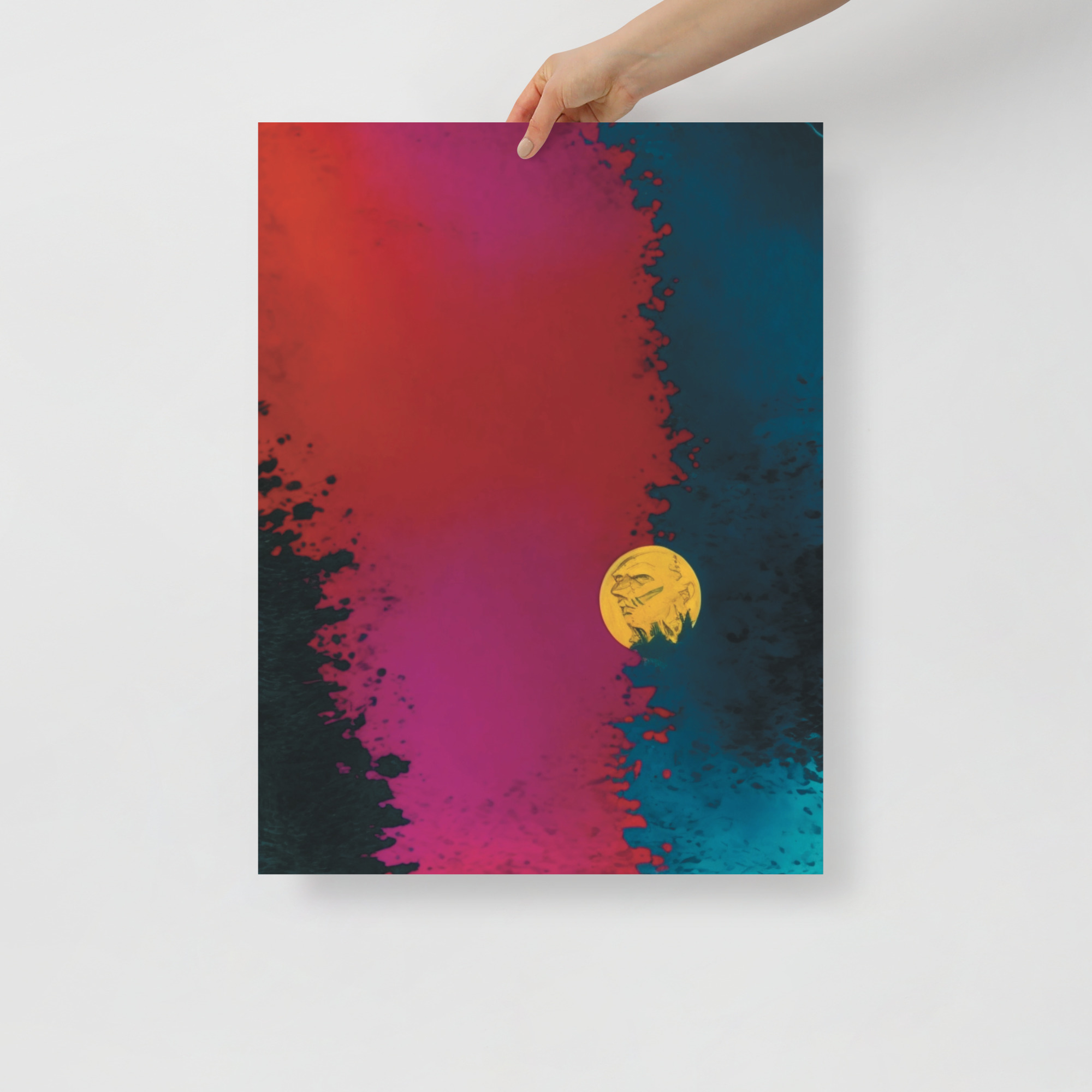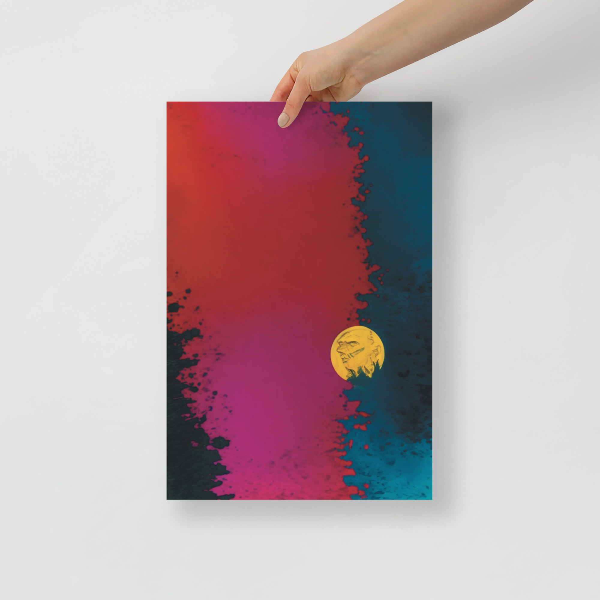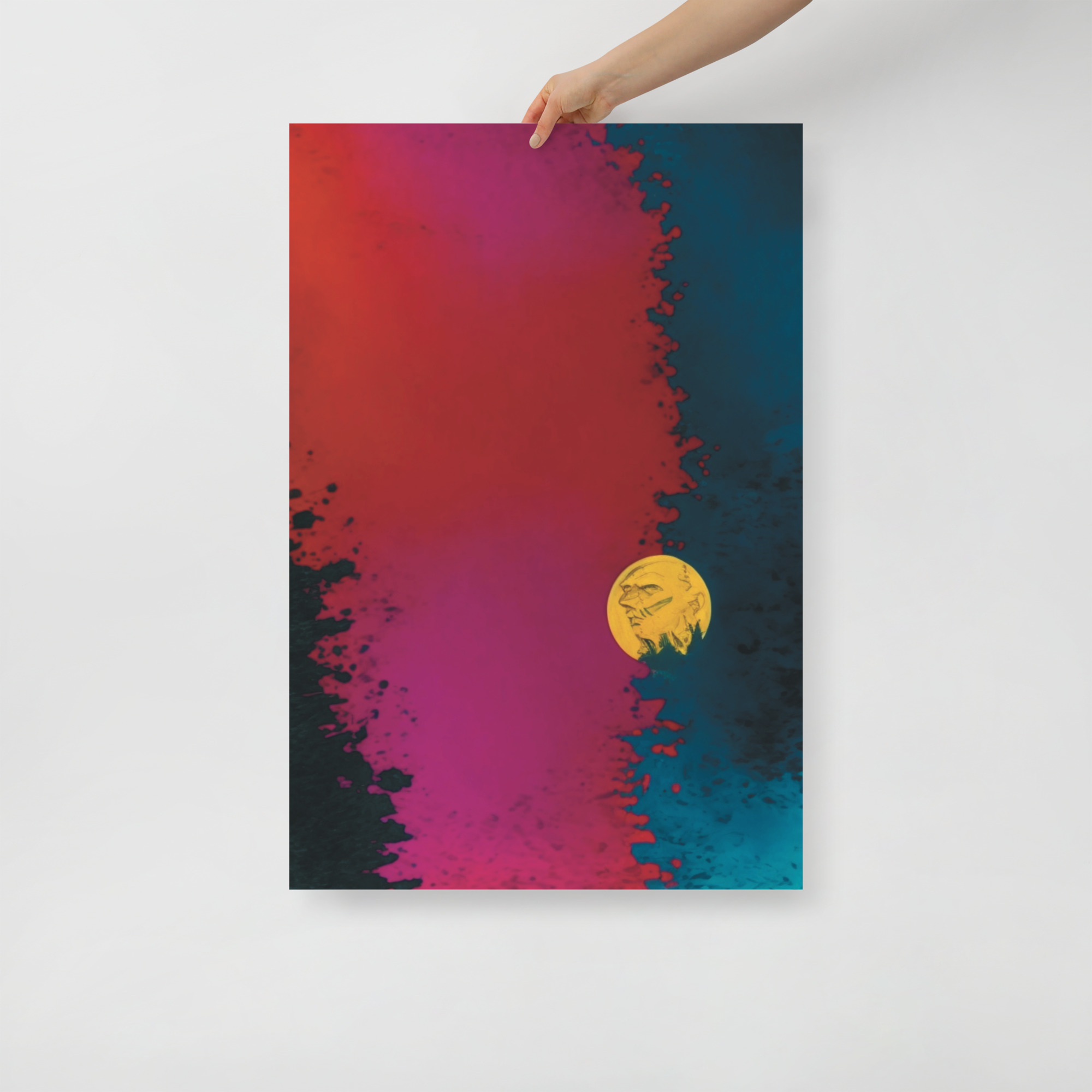“The Yellow Side of the Moon” features a stark contrast between the tranquil darkness of space and the vibrant life of an unknown cosmic phenomenon. Dominated by a central yellow moon that bears a mysterious face, the artwork is enveloped by a nebulous cloud of magenta and teal, which seems to radiate outward into the void. This ethereal haze blurs the line between gaseous celestial bodies and the liquid flow of an otherworldly ocean. The visual texture of the piece is reminiscent of ink diffusing in water, suggesting both serenity and a dynamic, unpredictable transformation.