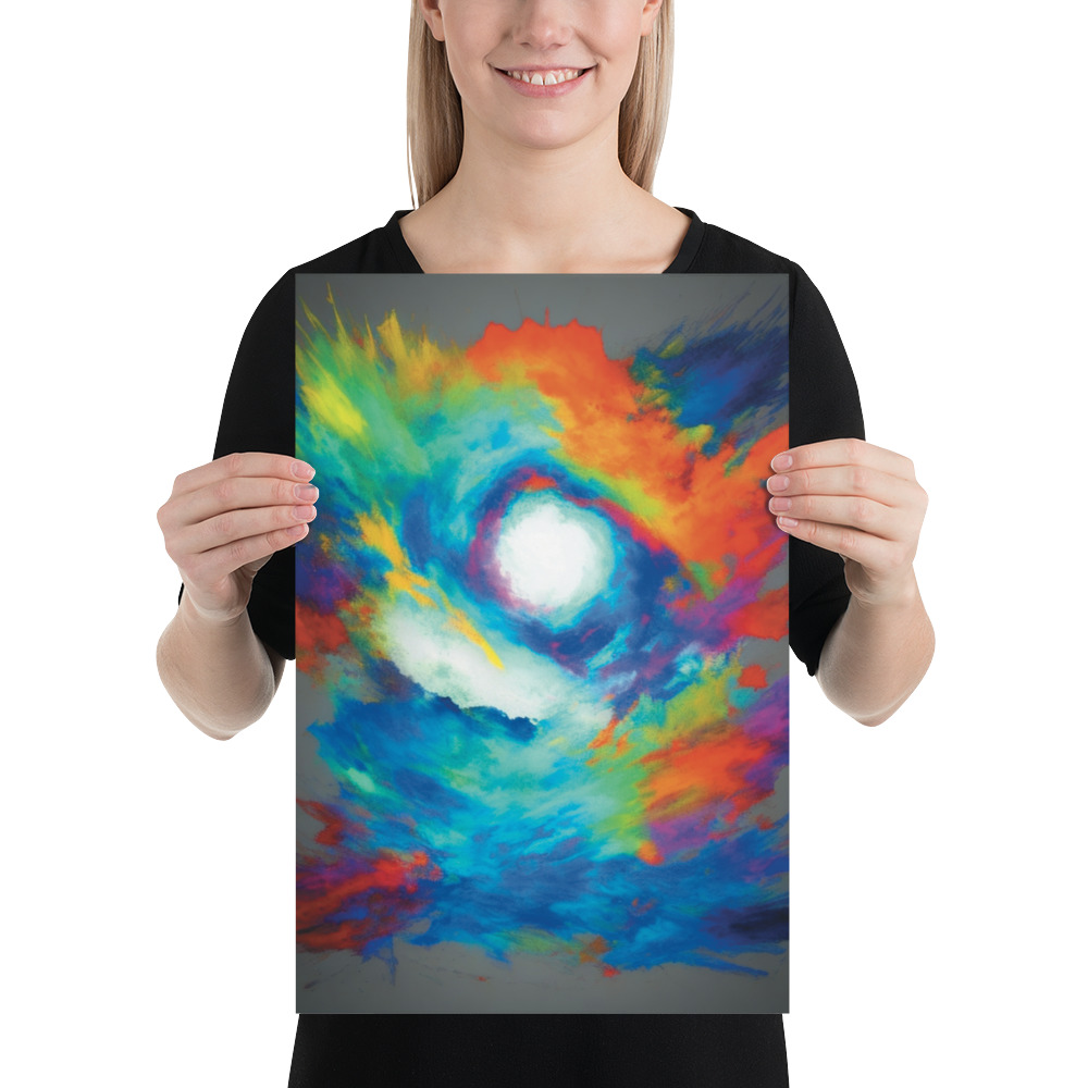 “White Hole in the Sky” is an abstract depiction of an astronomical phenomenon, presented as the inverse of a black hole. The central white void serves as a powerful source of light and energy, radiating vibrant colors across the canvas.