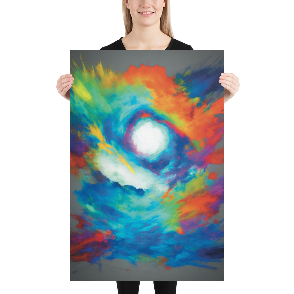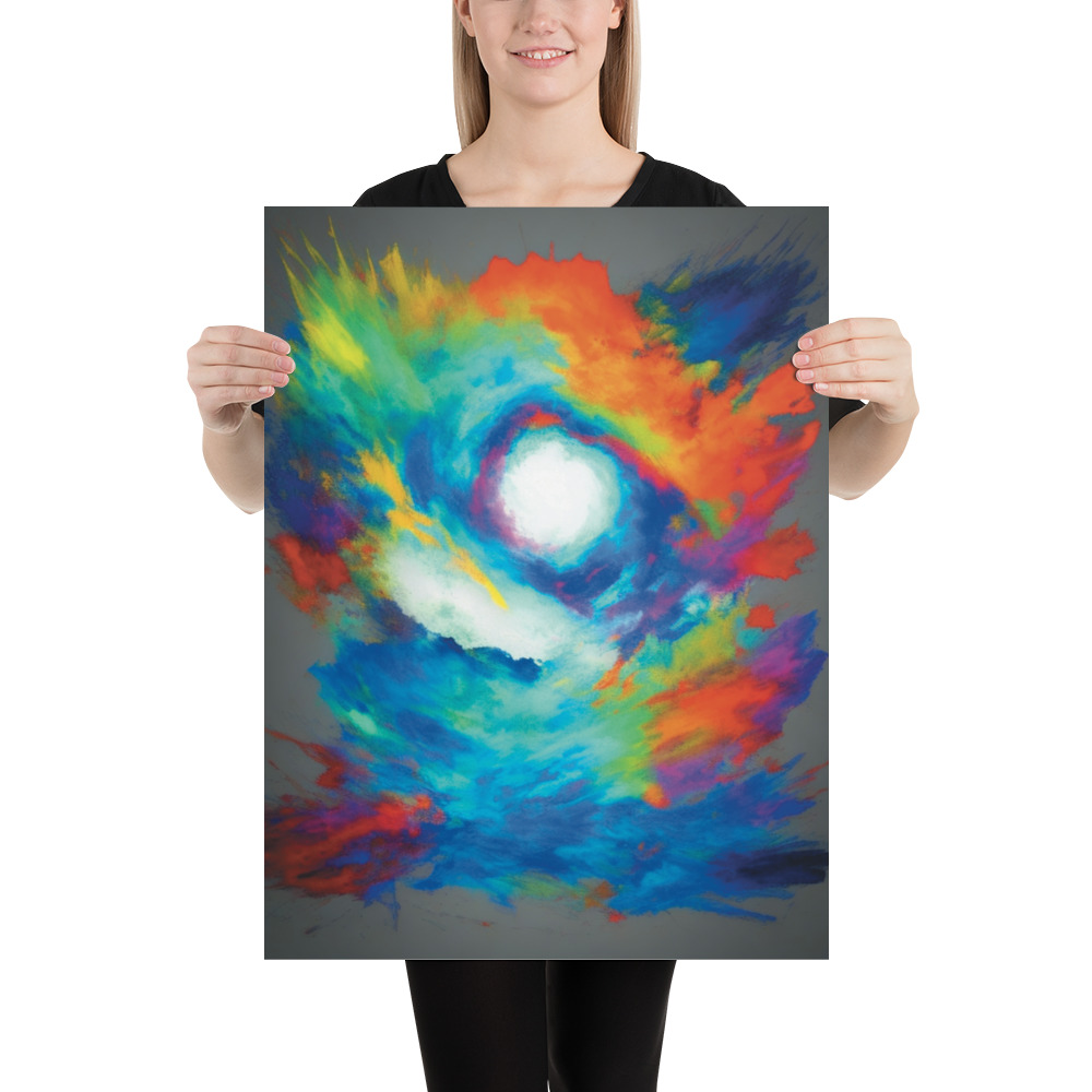 Fiery reds, electric blues, and vivid yellows and greens explode outward, simulating the birth of stars and the chaotic beauty of cosmic creation. The intense brightness at the core symbolizes an unstoppable force, a gateway to new beginnings, and the uncharted territories of the universe. This artwork invites contemplation of the wonders beyond our skies, evoking a sense of awe and the infinite possibilities of the cosmos.